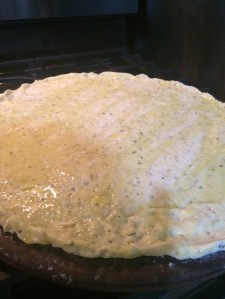 I like to roll mine out and brush with olive oil. I usually bake just the crust for 7-10 minutes on my pizza stone, then add toppings and finish off baking.